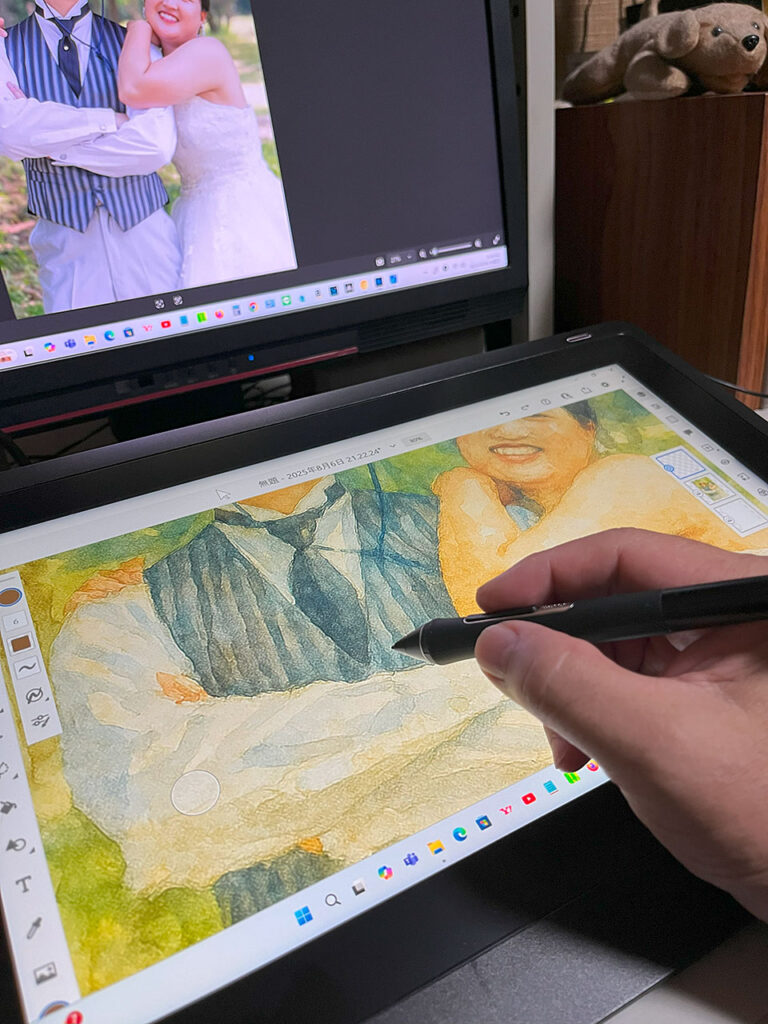 ペンタブでお絵描き ときどき日記 2025.08.08 お盆に帰省する息子夫婦へのプレゼントに、ウエディングフォトを見ながらお絵描きしています。 ペン・タブレットの拡大表示機能は老眼にはとてもありがたい!