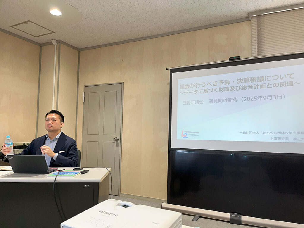 午前10時からは議会力向上特別委員会を開催し、(一社)地方公共団体政策支援機構の渡辺太樹氏による「議会が行うべき予算・決算審議について~データに基づく財政および総合計画との関連~」と題した研修を行いました。演習を交えたグループワークは大変具体的であり、10月に控える決算審査にすぐに役立つ内容でした。