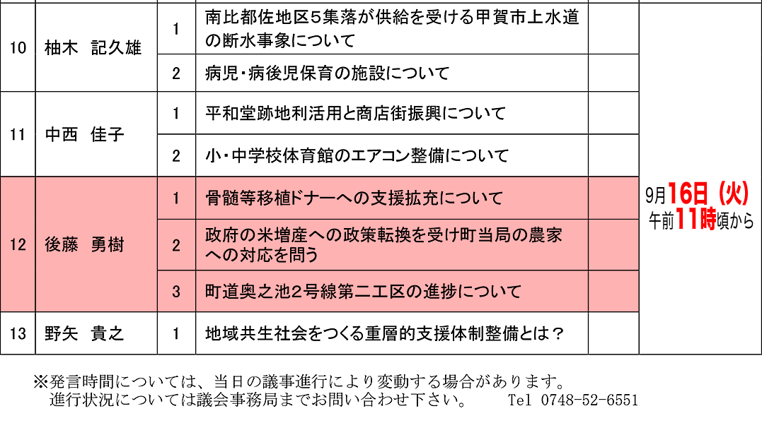 9月議会一般質問は16日11時頃より ごとう勇樹活動リポート 2025.09.12 日野町議会は本日(9月13日・金)、終日一般質問を行い、9議員が発言を行いました。 私・後藤は16日(火)午前11時頃より登壇し、以下の3項目について質します。 ●骨髄等移植ドナーの支援拡充について ●政府の米増産への政策転換を受け町当局の農家への対応を問う ●町道奥之池2号線第二工区の進捗について 今定例会は動画撮影機材の更新工事のため、インターネットでの動画配信はありません。 ぜひ日野町役場4階の議場へ傍聴にお越しくださいませ!