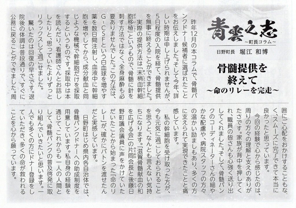 日野町行政が毎月発行している「広報ひの」12月号の町長コラム「青雲之志」に、堀江和博町長が、ご自身の骨髄提供体験と、想いを載せてくださいましたのでご紹介します。