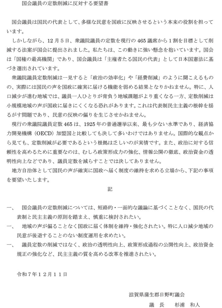 また、質疑の後は議会運営委員長として「国会議員の定数削減に反対する要望書決議」を議会に提出し、全員一致にて採択されました。