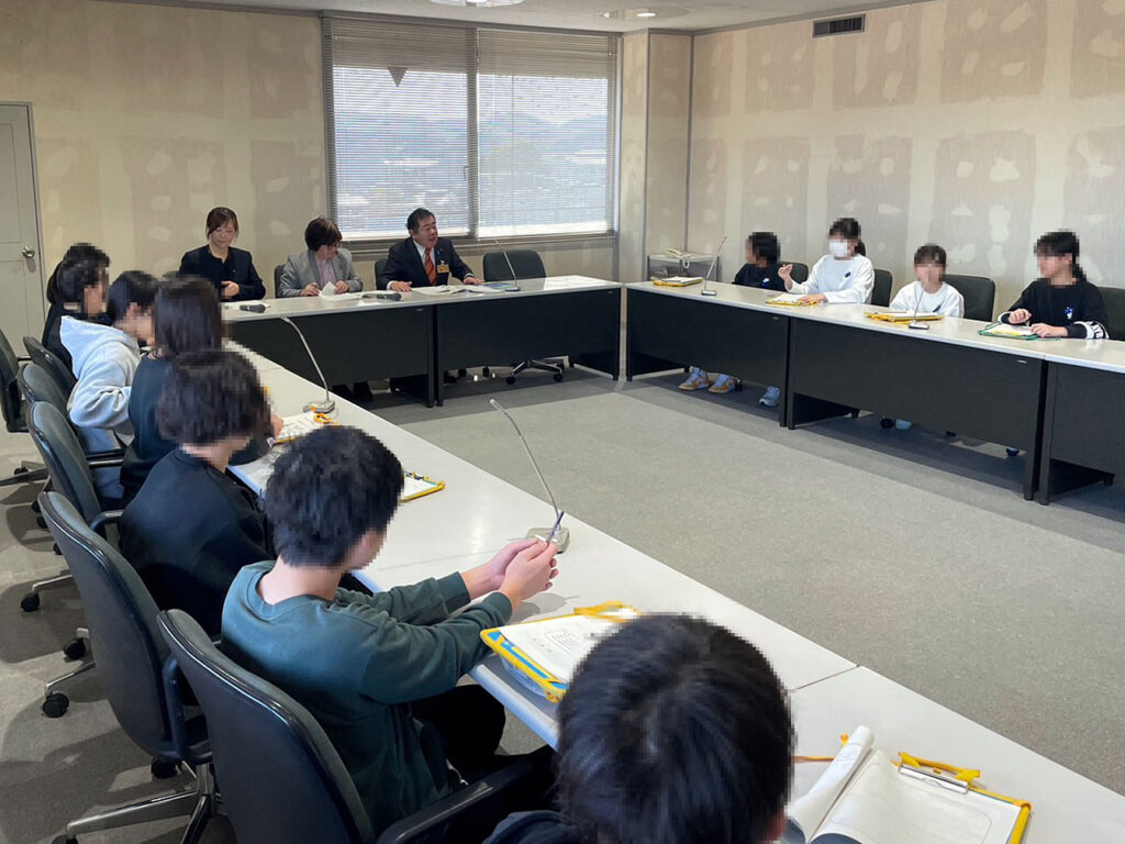議場で議員席に座って議会や予算、条例などについての説明を受けた後、議員控室、議長室、委員会室などを見学。その後は委員会室で質疑応答をしました。