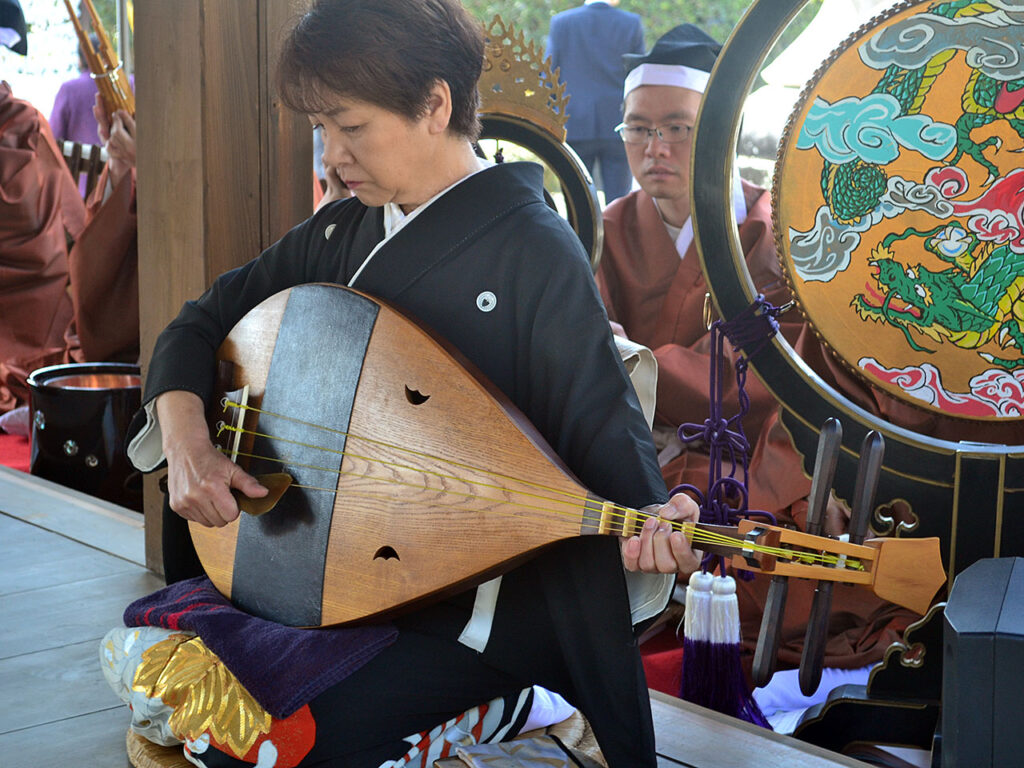 また日野雅楽会、みえ雅楽会による雅楽演奏では、日野町内はもとより、大津や三重、大阪、愛知、奈良からも楽人の方々が駆け付けてくださり、管弦「陪臚」、舞楽「蘭陵王」にて最高の雅楽演奏と舞を奉納してくださいました。