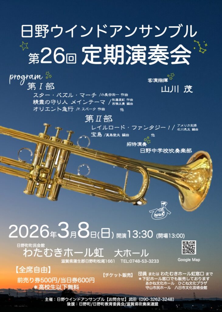 日野町民会館わたむきホール虹で日野ウインドアンサンブルさんの第26回定期演奏会が開催され、家内や日野雅楽会の有志と鑑賞させていただきました。