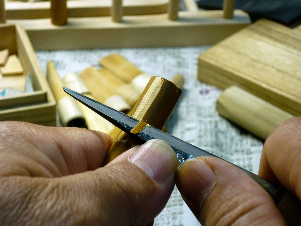 篳篥(ひちりき)のリード作り ときどき日記 2026.04.14 空いた時間に雅楽で使う篳篥(ひちりき)の盧舌(リード)を作っています。 今年は日野雅楽会に篳篥の方が4人入ってくださいましたので、時間のあるときに作りだめをしておきます。 大阪・鵜殿産の煤かけ葦を削っていきます これから仕上げに入ります