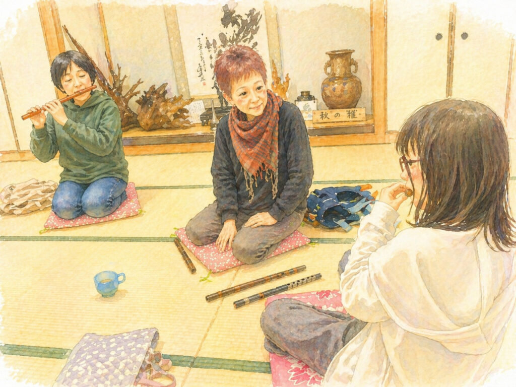 前回篳篥(ひちりき)を体験していただいたお子さんに、今日は龍笛(りゅうてき)を体験していただきましたが、やはり篳篥が気に入られたようで、私が担当させていただくことになりました。初めての人はなかなか思った音が出しにくいと言われる篳篥ですが、見様見真似でも、すぐに音が出せるようになる子どもさんには驚きです。